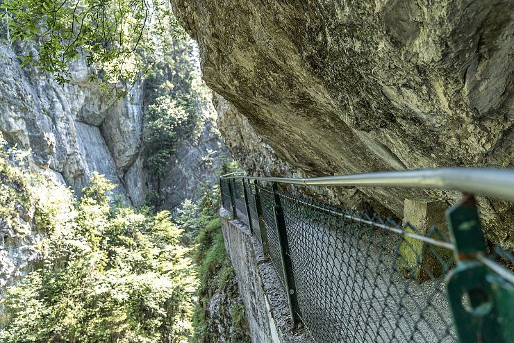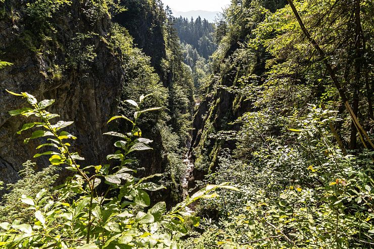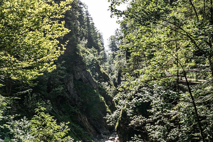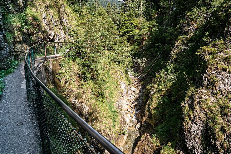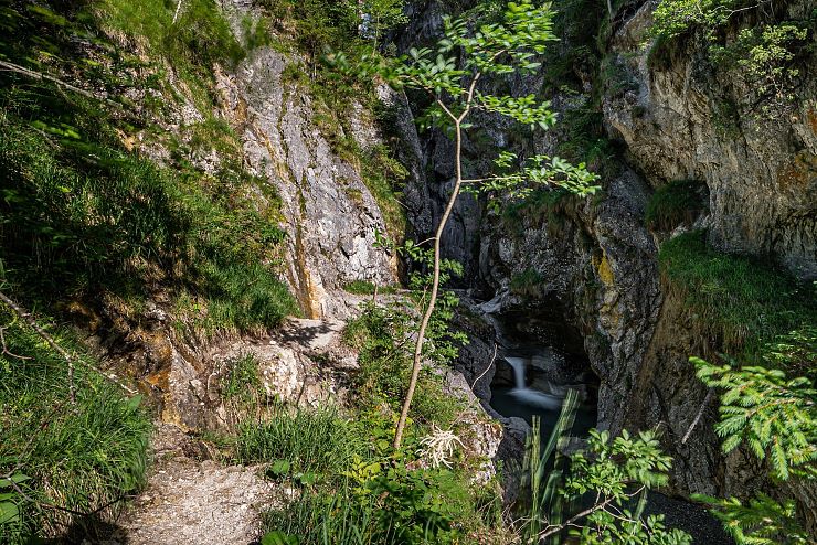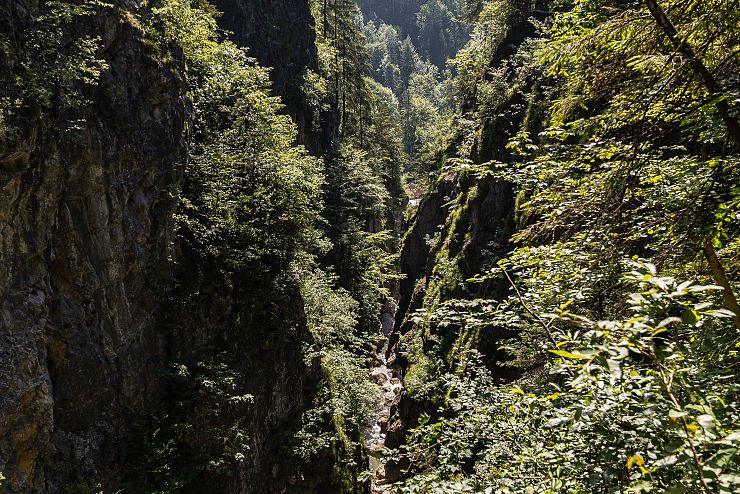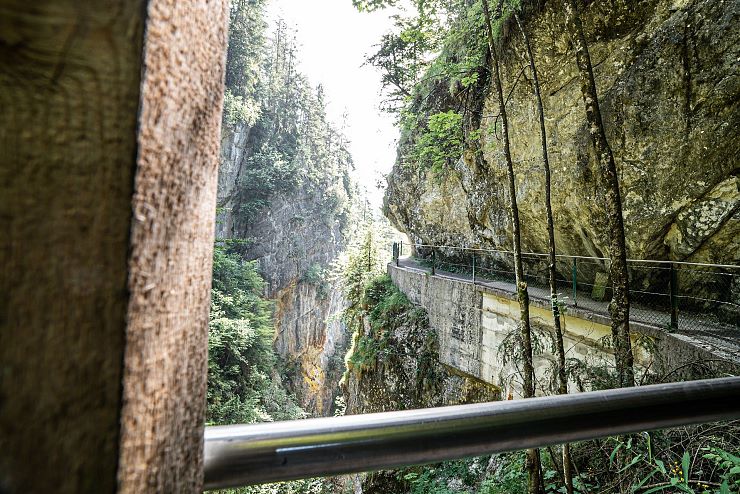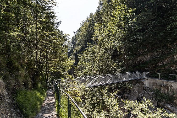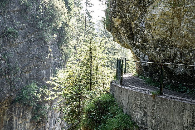 Hat man sich satt gesehen, wandert man weiter den Felsen entlang. Anhand dieser Schlucht erkennt man, welche ungeheure Kraft im Wasser steckt: Der stete Tropfen höhlt den Stein - seit Jahrhunderten gräbt sich der Bach in den Berg. Am Ende der vorderen Gießenbachklamm wagt man eine Überquerung derselben. Auf der Brücke stehend, darf man sich noch einmal dem Blick in die Tiefe hingeben und verzaubert sein von der Schönheit dieses Naturjuwels.