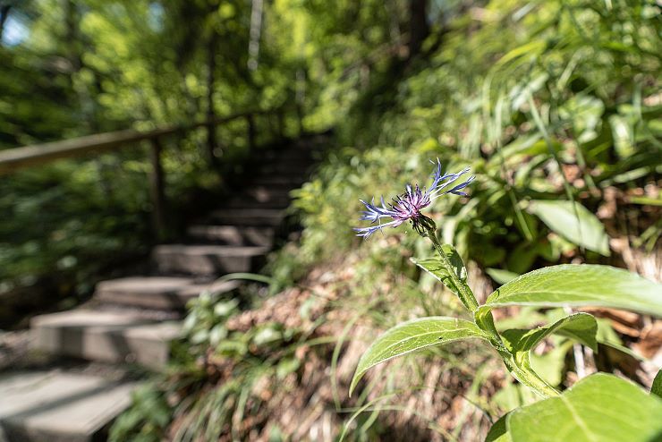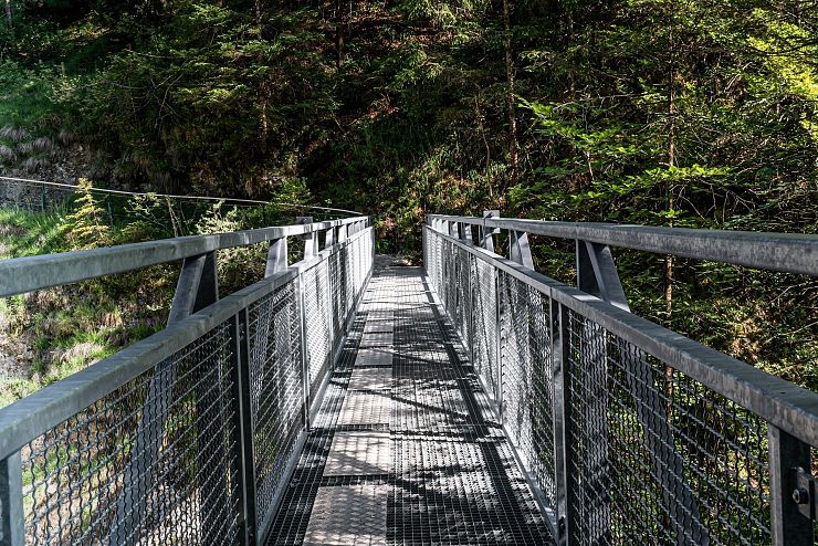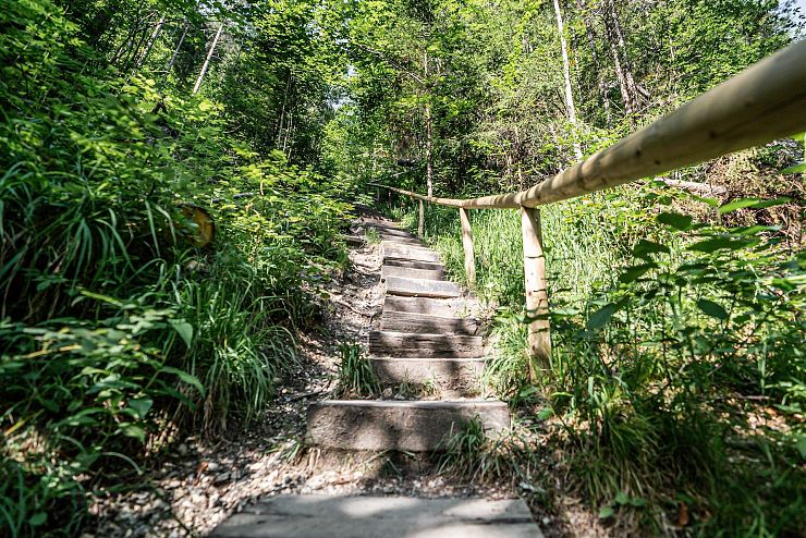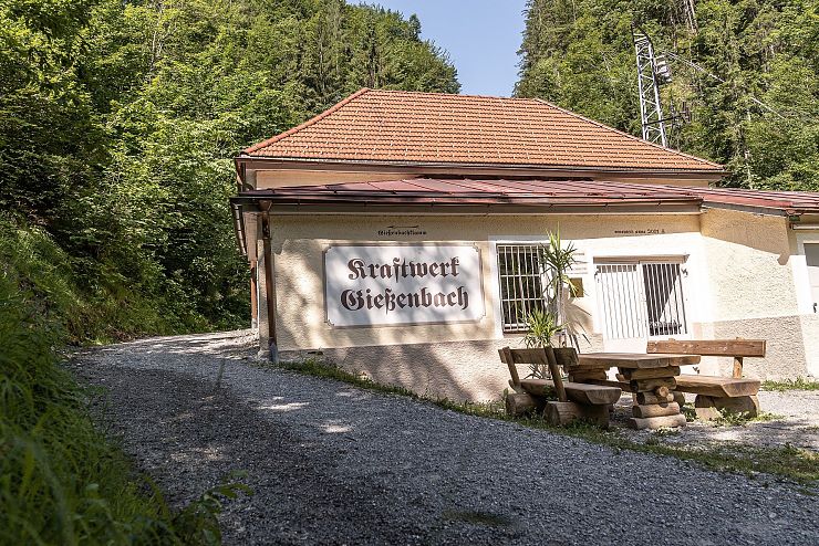 Der wildromantische Weg durch die Gießenbachklamm wurde um die Jahrhundertwende in den blanken Fels gehauen: Für das geplante Elektrizitätswerk wollte man eine Verbindung schaffen, zwischen dem malerischen Stausee im Oberlauf der Klamm und dem 150 Meter tiefer liegenden Werk. Diesen Höhenunterschied gilt es nun zu erklimmen: Über 197 Holzstufen geht es steil nach oben. Den Bach verliert man in diesem Moment kurz aus den Augen; wenig später kehrt er auf atemberaubende Weise zurück.
