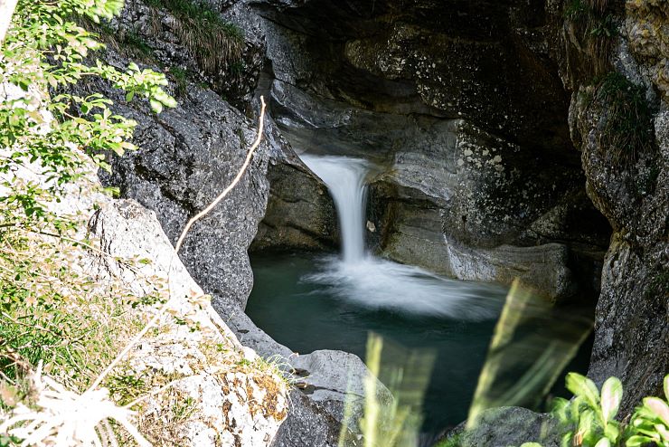Die Oberfläche der glatt geschliffenen Felsen glänzt mattschwarz. Durch die grünen Wipfel der Bäume fallen einzelne Sonnenstrahlen in die Schlucht. Tief unten springt das Wasser in schäumendem Weiß über die Steine. Eine Naturszene von unbändiger Schönheit, die sich in den menschlichen Geist eingräbt, wie sich das Wasser in den Stein gegraben hat. In der Gießenbachklamm erlebt man die Kraft des Wassers hautnah. Ein unvergessliches Naturerlebnis.