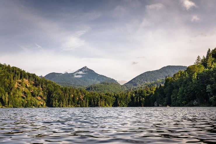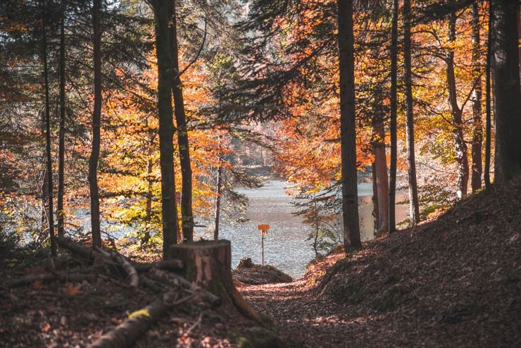 Vom Parkplatz am Hechtsee führt der Weg unmittelbar am Wasser entlang, über weichen Waldboden und feinen Schotter, vorbei an stillen Uferabschnitten bis zum Seeabfluss, wo eine kleine Brücke den Weg über das Wasser führt. Danach begleitet der Pfad das ruhige Gegenüber des Sees, mit offenen Blicken auf das Wasser und das Kaisergebirge, das sich bei klarer Stimmung im See spiegelt, bevor der Rundweg wieder zum Ausgangspunkt zurück führt.