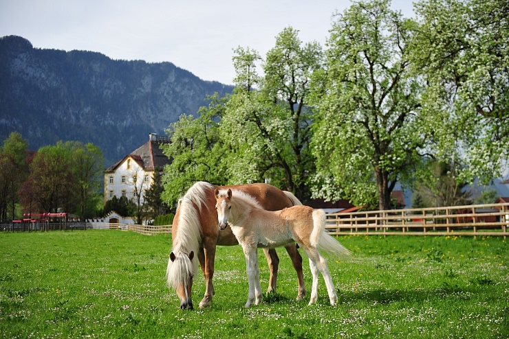Con irruenza il piccoletto corre sul prato, si pianta, scalpita, scalcia e si alza sulla zampe posteriori. Le cavalle sembrano non curarsi del piccolo e tornano ad assaporare l'erba. Un vero idillio per gli Haflinger al centro mondiale di allevamento del cavallo avelignese, il Fohlenhof di Ebbs.