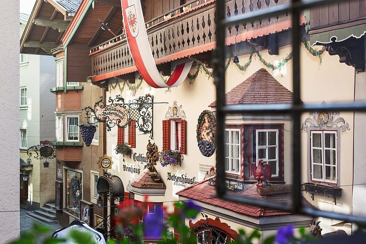 Le rosse imposte sono aperte, ed incorniciano la piccola finestra con gli elementi bianchi. Piccoli angoli ovunque si guardi. Fiori pensili e piccoli vasi trasformano le facciate in un mare di fiori. Incrociamo piccole stradelle che passano tra le case. C'è un odore seducente. Lo sguardo rimane fisso sugli affreschi murali delle case. Un luogo meraviglioso. Immergetevi nel passato. Un vicolo attraverso un mondo dove tutto inizia con il classico "c'era una volta". La Römerhofgasse di Kufstein.