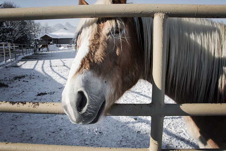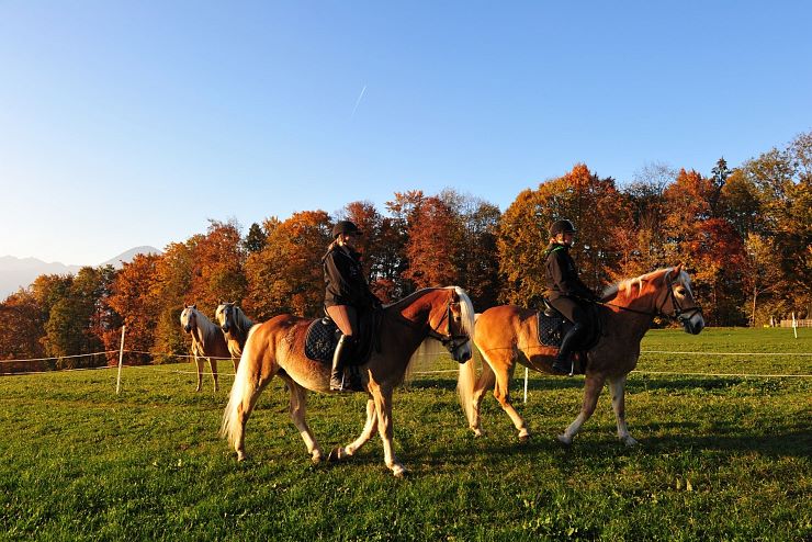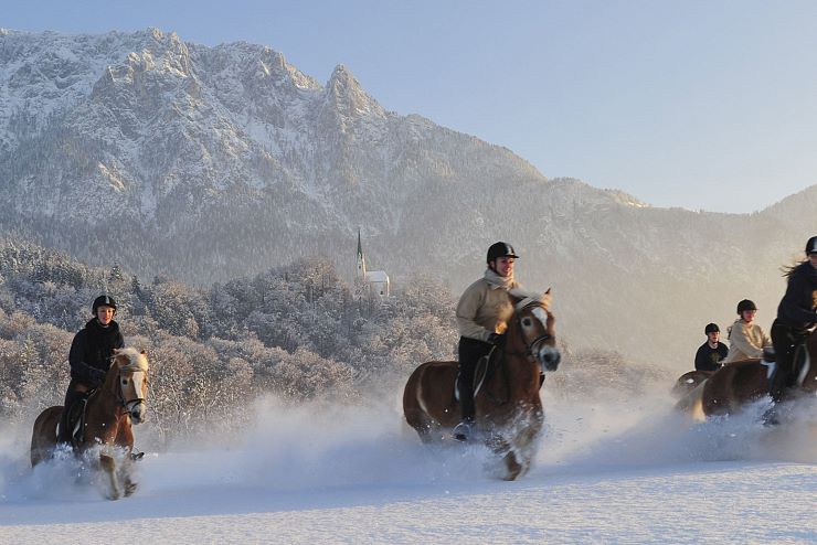 La neve crea delle nuvole polverose mentre il respiro è visibile sotto forma di piccole nuvole di vapore. Lentamente il Sole scompare dietro le cime delle montagne tirolesi della Kufsteinerland e lascia che la natura tirolese si immerga in una luce misteriosa. Procediamo al galoppo ai piedi dello Zahmen Kaiser. Cavalcare con i cavalli tirolesi. Una escursione presso il centro mondiale di allevamento del cavallo avelignese, il Fohlenhof di Ebbs.